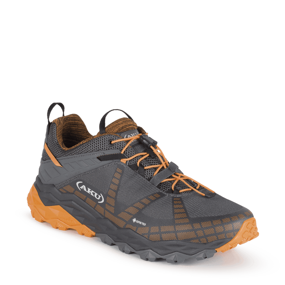 Calzatura da escursionismo veloce e per attività dinamiche, adatta per avventure off-road dov'è richiesta trazione, protezione e alta ammortizzazione. La suola Vibram Traction Lugs con Megagrip e zeppa High Cushion e High Rebound EVA offre aderenza e ammortizzazione sorprendenti. Addotta la tecnologia Dynamic Fit, che permette di adattare dinamicamente la tensione del tallone al proprio passo con un migliore comfort e stabilità e il sistema AKU Elica Natural Stride System per favorire l'efficienza biodinamica.