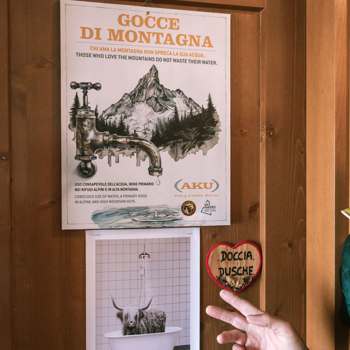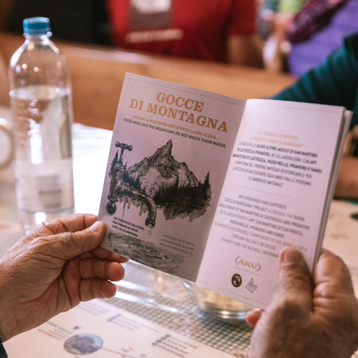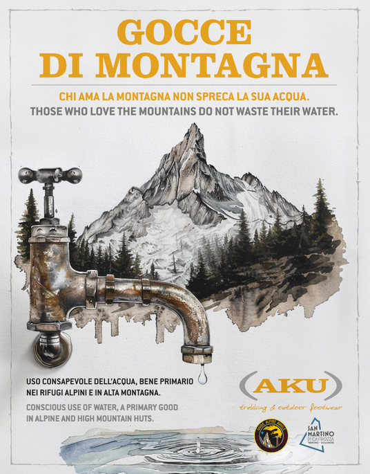 Gocce di Montagna è un progetto ideato da AKU e dalle Guide Alpine di San Martino di Castrozza per informare tutti gli escursionisti sull’uso dell’acqua, bene primario nei rifugi alpini e in alta montagna. Da sempre AKU è attivo in azioni volte ad una maggiore consapevolezza ambientale promuovendo un approccio sostenibile alle attività all’aria aperta come l’escursionismo, l’arrampicata, lo scialpinismo, il canyoning.