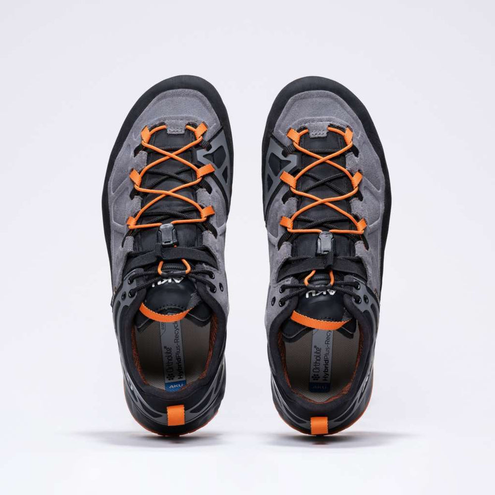 Schuhe für den technischen Zustieg und leichtes Klettern, für Klettersteige und Wanderungen auf Bergpfaden auch bei Regen. Weiterentwicklung des Modells Rock mit verbesserter technischer Passform. Das Obermaterial aus Wildleder, Textil und abriebfester Mikrofaser ist mit einem Gummischutz ausgestattet, der den Keil beim Klettern umschließt und schützt. Die asymmetrische Zwischensohlenkonstruktion aus EVA und PU mit doppelter Dichte basiert auf dem AKU Elica Natural Stride System, das die biodynamische Efizienz fördert. Individuelle Anpassung der Passform mit dem doppelten Schnürsystem Dual Fit System, das eine Anpassung des Komforts und der Präzision der Passform in den verschiedenen Gebrauchsphasen ermöglicht: eine traditionelle Schnürung für maximalen Komfort beim Zustieg und eine Schnellschnürung für mehr Sensibilität und Präzision beim Klettern, selbst an den schmalsten Tritten. Die Vibram Approach-Sohle mit Hochleistungs-Megagrip-Mischung bietet maximalen Grip und ein kletterspezifisches Design.