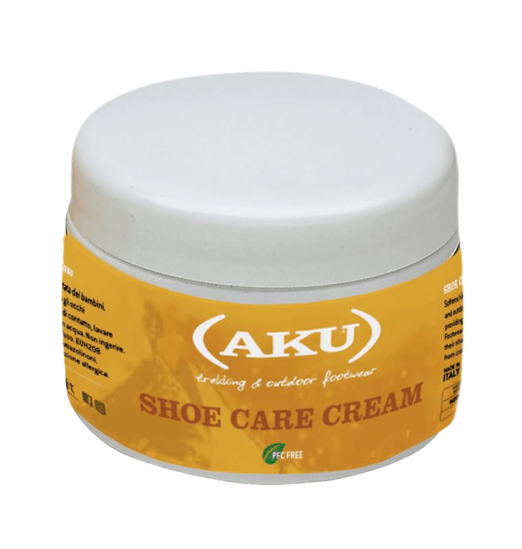 Zwei eigens für die Pflege von AKU-Schuhen ausgearbeitete Produkte: eine auffrischende Nährcreme für Naturleder und ein Spray, der sowohl Leder als auch Gewebe wasser- und ölabweisend gestaltet. Anwendungsfreundlich in wenigen Sekunden, lässt Farben und natürliche Eigenschaften des Leders unverändert.