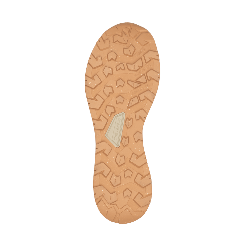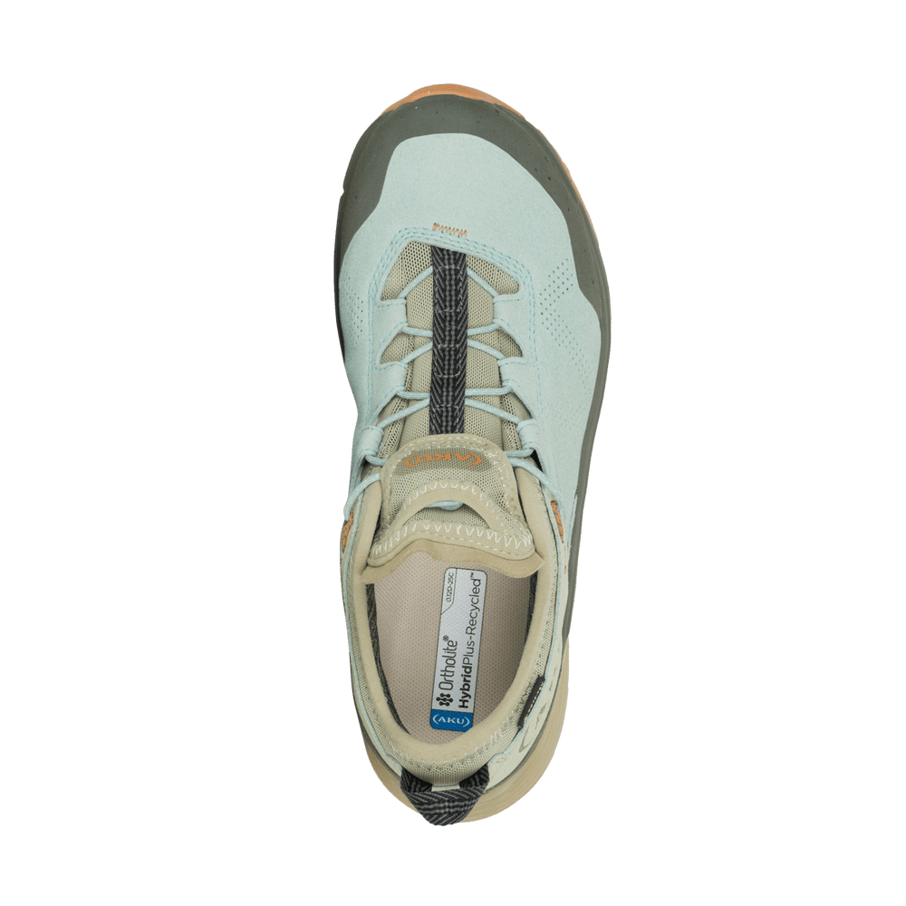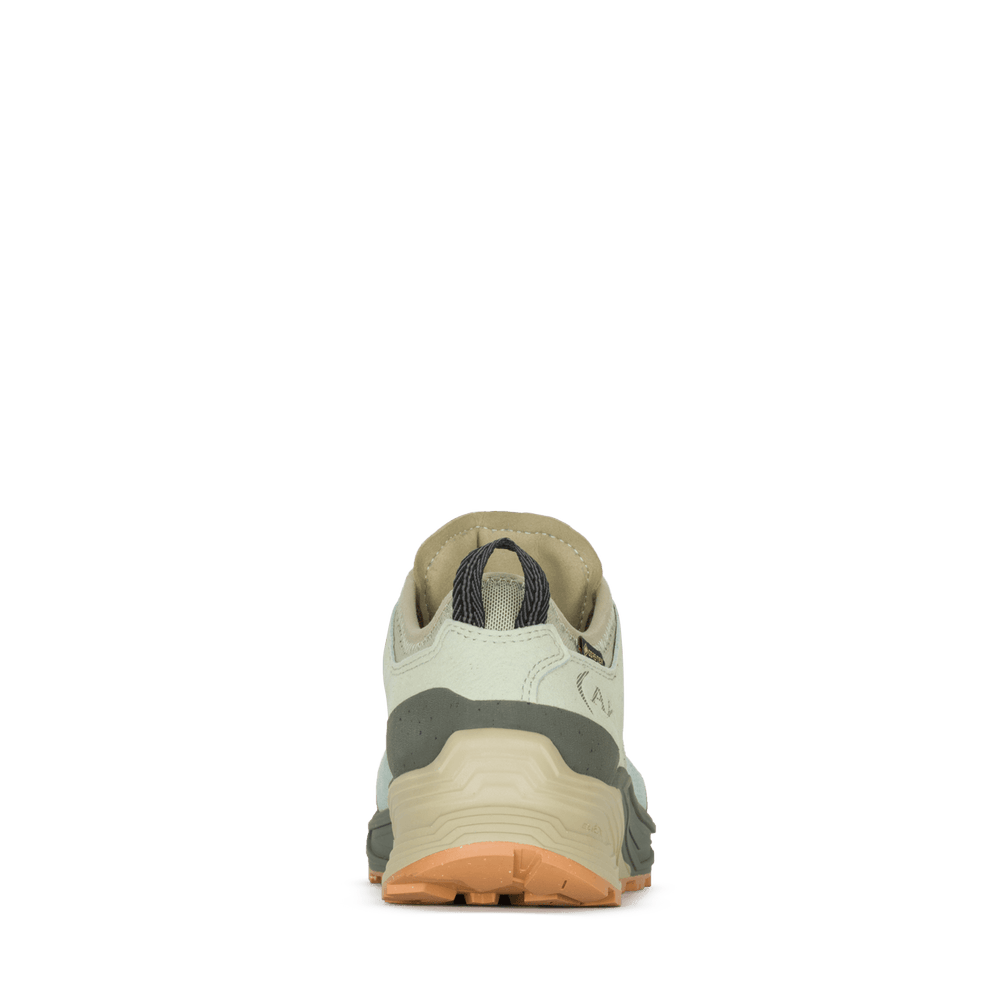 Vielseitiges Modell, das sich für zahlreiche Outdoor-Aktivitäten eignet, darunter leichtes und schnelles Wandern, E-Biking und Stadtabenteuer. Das Obermaterial besteht vollständig aus nicht-tierischen und recycelten Materialien. Die wasserabweisenden Behandlungen sind PFAS-frei, ebenso wie das wasserdichte Gore-Tex-Futter aus ePE. Die beiden Dichten des Keils und der Lauffäche werden gemeinsam geformt, um den Einsatz von Klebstoffen zu reduzieren. Das verwendete EVA ist teilweise biobasiert. Die Lauffäche besteht aus teilweise recyceltem Gummi mit einem asymmetrischen Design im Einklang mit dem AKU Elica Natural Stride System, das die biodynamische Effzienz fördert. Der innere Teil des Vorfußes hat eine erhöhte Zehenkappendichte, um den Grip auf E-Bike-Pedalen zu fördern.
