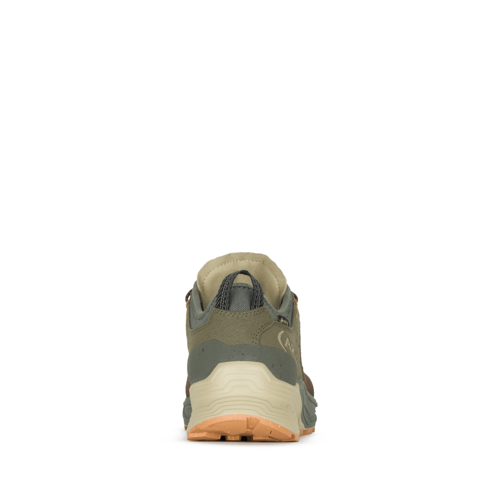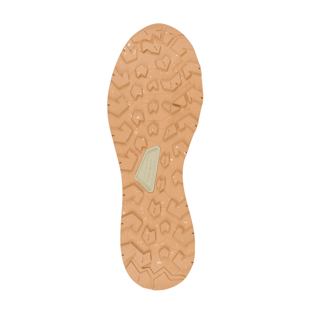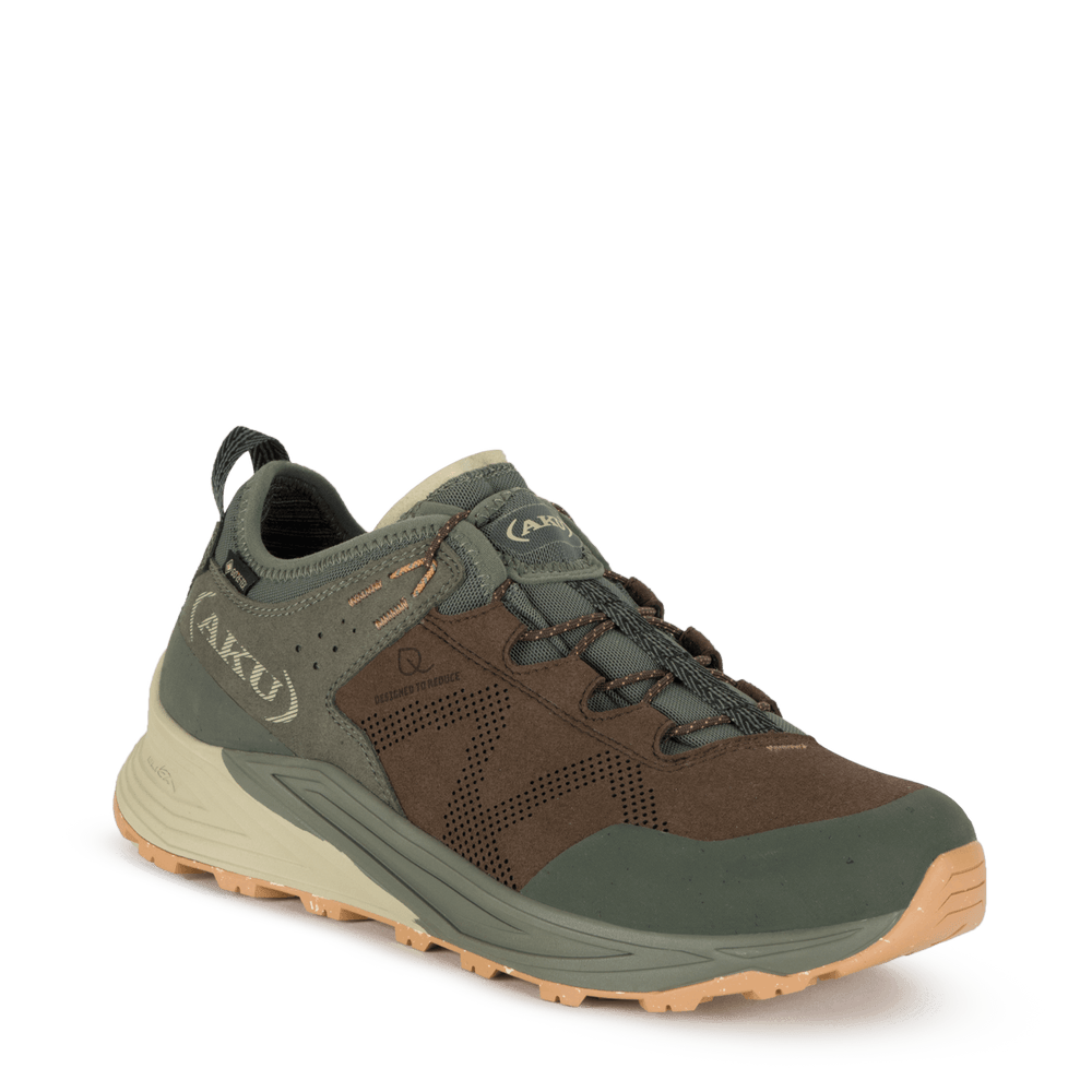 Vielseitiges Modell, das sich für zahlreiche Outdoor-Aktivitäten eignet, darunter leichtes und schnelles Wandern, E-Biking und Stadtabenteuer. Das Obermaterial besteht vollständig aus nicht-tierischen und recycelten Materialien. Die wasserabweisenden Behandlungen sind PFAS-frei, ebenso wie das wasserdichte Gore-Tex-Futter aus ePE. Die beiden Dichten des Keils und der Lauffäche werden gemeinsam geformt, um den Einsatz von Klebstoffen zu reduzieren. Das verwendete EVA ist teilweise biobasiert. Die Lauffäche besteht aus teilweise recyceltem Gummi mit einem asymmetrischen Design im Einklang mit dem AKU Elica Natural Stride System, das die biodynamische Effzienz fördert. Der innere Teil des Vorfußes hat eine erhöhte Zehenkappendichte, um den Grip auf E-Bike-Pedalen zu fördern.