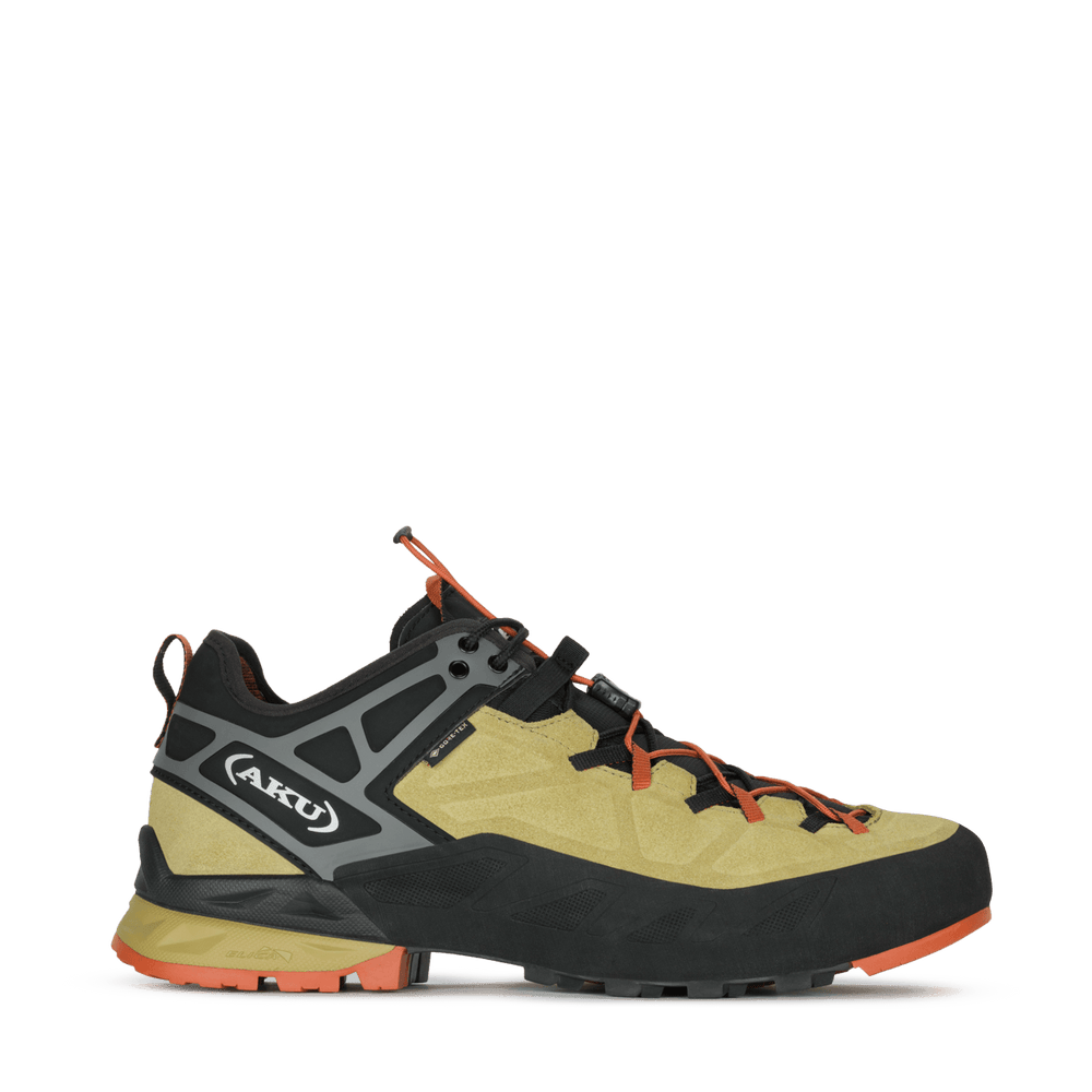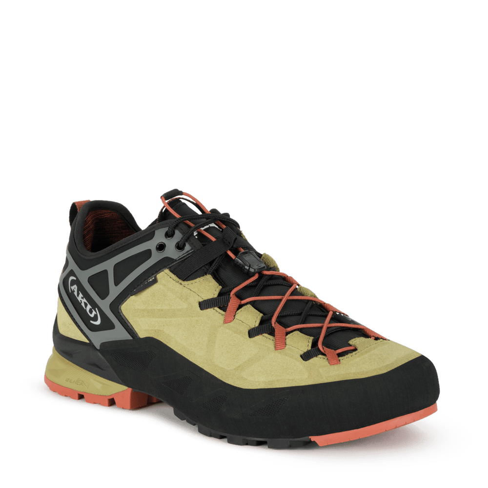 Schuhe für den technischen Zustieg und leichtes Klettern, für Klettersteige und Wanderungen auf Bergpfaden auch bei Regen. Weiterentwicklung des Modells Rock mit verbesserter technischer Passform. Das Obermaterial aus Wildleder, Textil und abriebfester Mikrofaser ist mit einem Gummischutz ausgestattet, der den Keil beim Klettern umschließt und schützt. Die asymmetrische Zwischensohlenkonstruktion aus EVA und PU mit doppelter Dichte basiert auf dem AKU Elica Natural Stride System, das die biodynamische Efizienz fördert. Individuelle Anpassung der Passform mit dem doppelten Schnürsystem Dual Fit System, das eine Anpassung des Komforts und der Präzision der Passform in den verschiedenen Gebrauchsphasen ermöglicht: eine traditionelle Schnürung für maximalen Komfort beim Zustieg und eine Schnellschnürung für mehr Sensibilität und Präzision beim Klettern, selbst an den schmalsten Tritten. Die Vibram Approach-Sohle mit Hochleistungs-Megagrip-Mischung bietet maximalen Grip und ein kletterspezifisches Design.