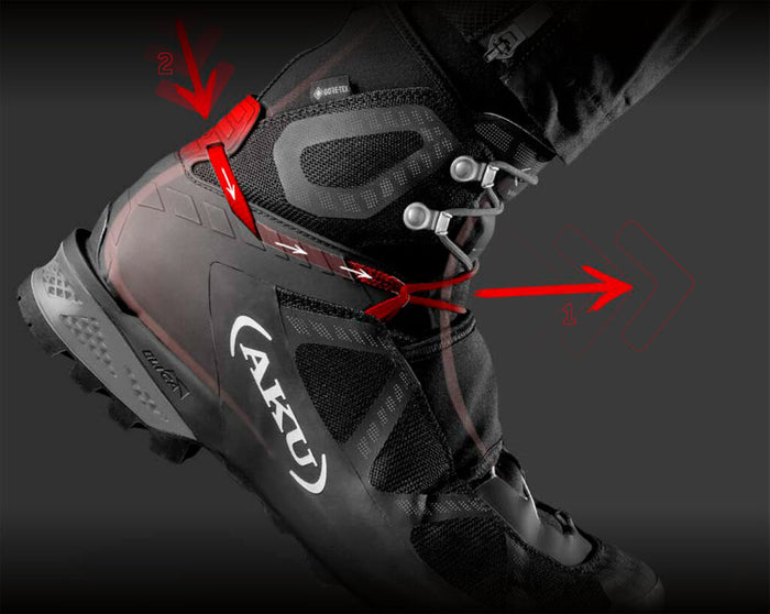 The forward step generates tension on the laces connected to the floating webbing located behind the heel (1). The heel counter moves forward, locks the heel in place and reduces slippage (2).