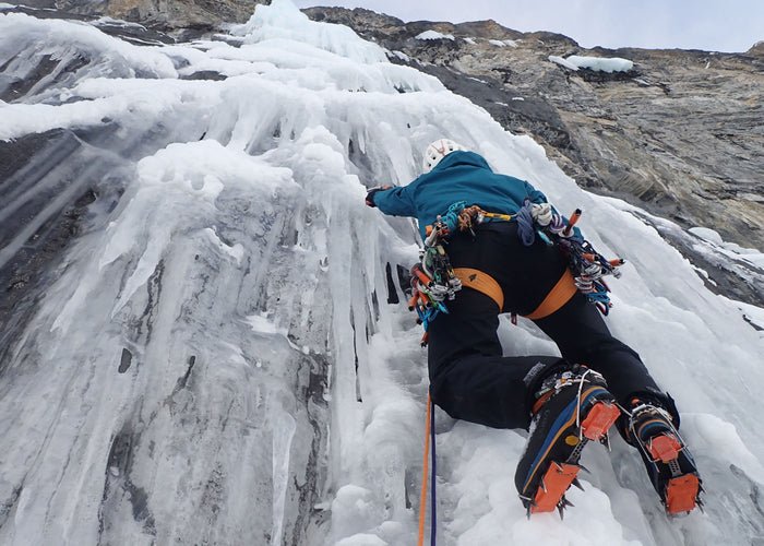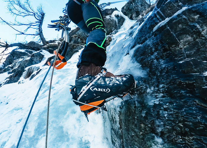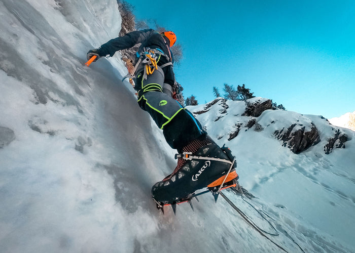 Alessandro Beltrame , filmmaker and mountaineer who has collaborated with AKU for several years, has chosen Aurai DFS GTX for his winter climbs. We see him engaged in the Salto dei Pachidermi waterfall in Val Varaita (Piedmont) and in the Nicchia waterfall in the municipality of Gressoney la Trinitè (Valle d'Aosta).