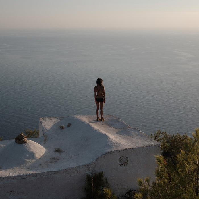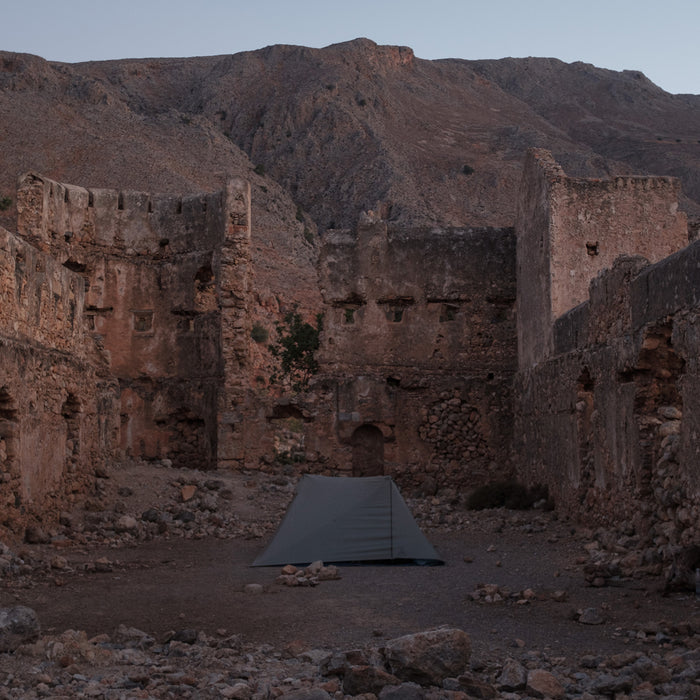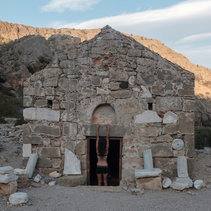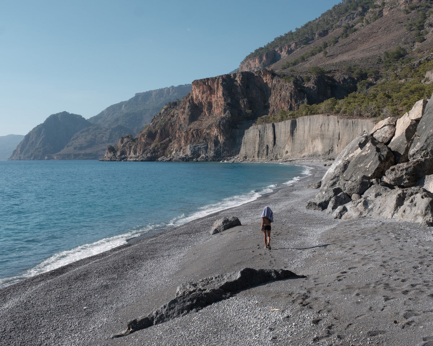 Inselvatichiti dal campeggio libero di Aghia Roumeli, è negli ultimi giorni di cammino che completiamo la nostra trasformazione. Strada facendo ci siamo spogliati di tutto quello che non è essenziale. Tra la terra arida e l’aria salmastra siamo rimasti soltanto noi e il nostri corpi di cui prenderci cura. È tutto molto semplice qua al caldo dove bastano pochi vestiti, pochi gesti e molta acqua. L’ultima notte a Loutro, dopo un aperitivo di feta, pomodoro e vino bianco, suoniamo per l’ultima volta la campana di una chiesa tra gli scogli. Qui non arrivano strade. Dormiamo sotto le stelle, dentro le rovine di un castello che sovrasta il porto. Poco prima di addormentarmi mi viene in mente una frase che devo aver letto in Moby Dick riguardo a un’isola lontanissima: “Non è segnata in nessuna carta: i luoghi veri non lo sono mai.” Cade una stella cadente. Sogno.