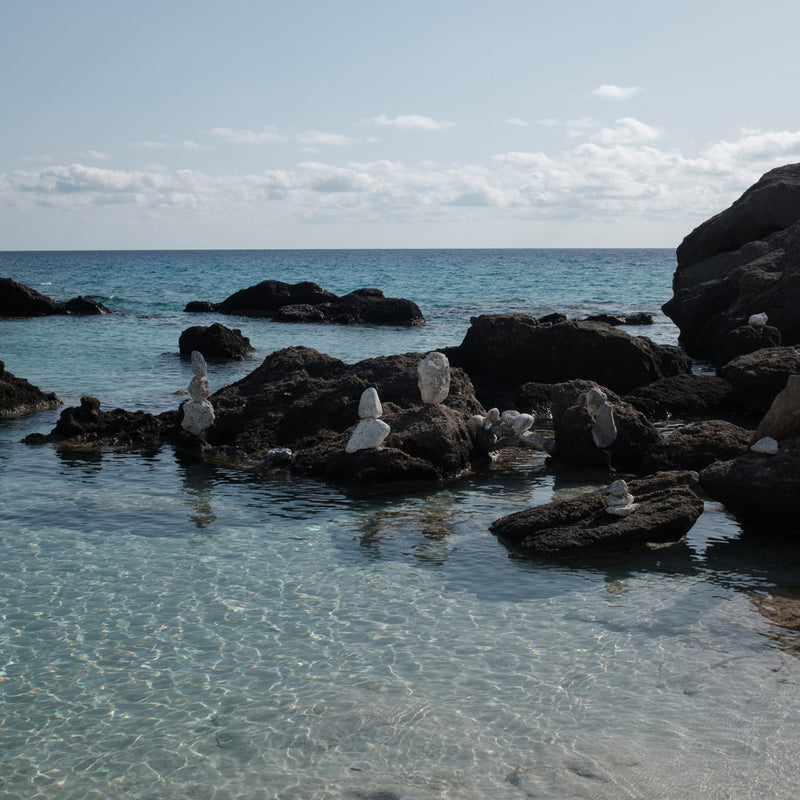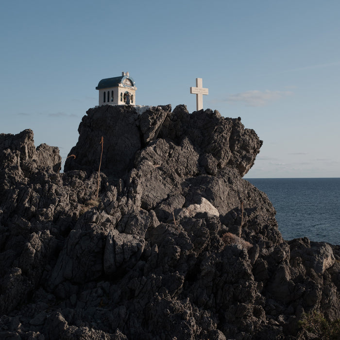 Immediatamente ci perdiamo nella pungente macchia mediterranea e soltanto un’altura ci fa ritrovare la strada: avvistiamo la rosacea spiaggia di Elafonissi, brulicante di minuscoli esseri umani. Passiamo oltre tra alberi di cedro e spiagge dove la nudità è norma. Cappellette votive appaiono di tanto in tanto, come sulle nostre Alpi, solo che qua ricordano naufragi. Sono delle chiese in miniatura, appoggiate sugli scogli e colorate di bianco e di blu. Sulla spiaggia troviamo una distesa di cocci d’anfora e ci metto un po’ ad accorgermi che la pietra su cui sono seduto era un’antica colonna incrostata di mare. Sono sempre i tramonti a farci trovare tesori inattesi. È l’ora a rendere magico un luogo oppure è solo perché a quel luogo eravamo predestinati? In una rada in mezzo al nulla giacciono abbandonate centinaia di case di pietra. Dove sono andati? Doveva essere piena di vita Lissos duemila anni fa quando si portavano le offerte al Dio Asclepio, che quasi fece fallire Ade con la sua mania di curare i mortali. Ci guardiamo bene dal non disturbare i suoi serpenti e ci addormentiamo esausti ma felici.