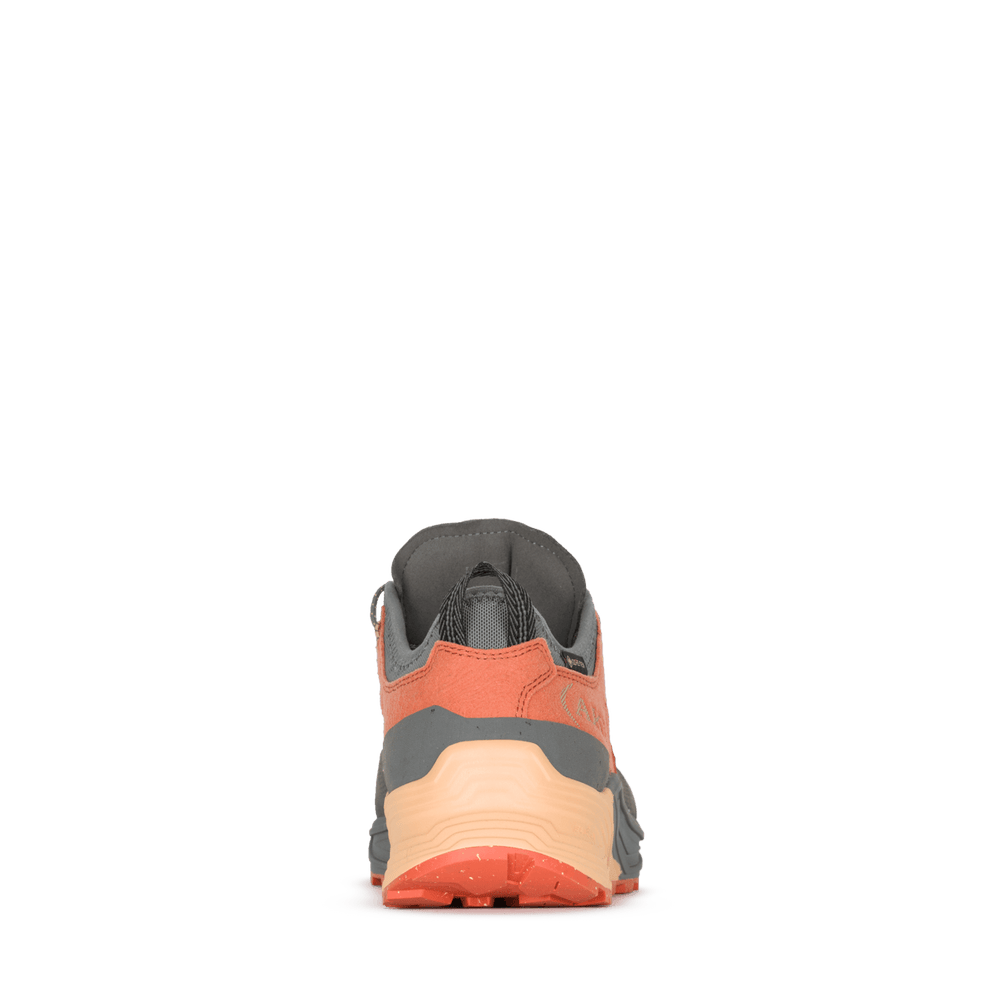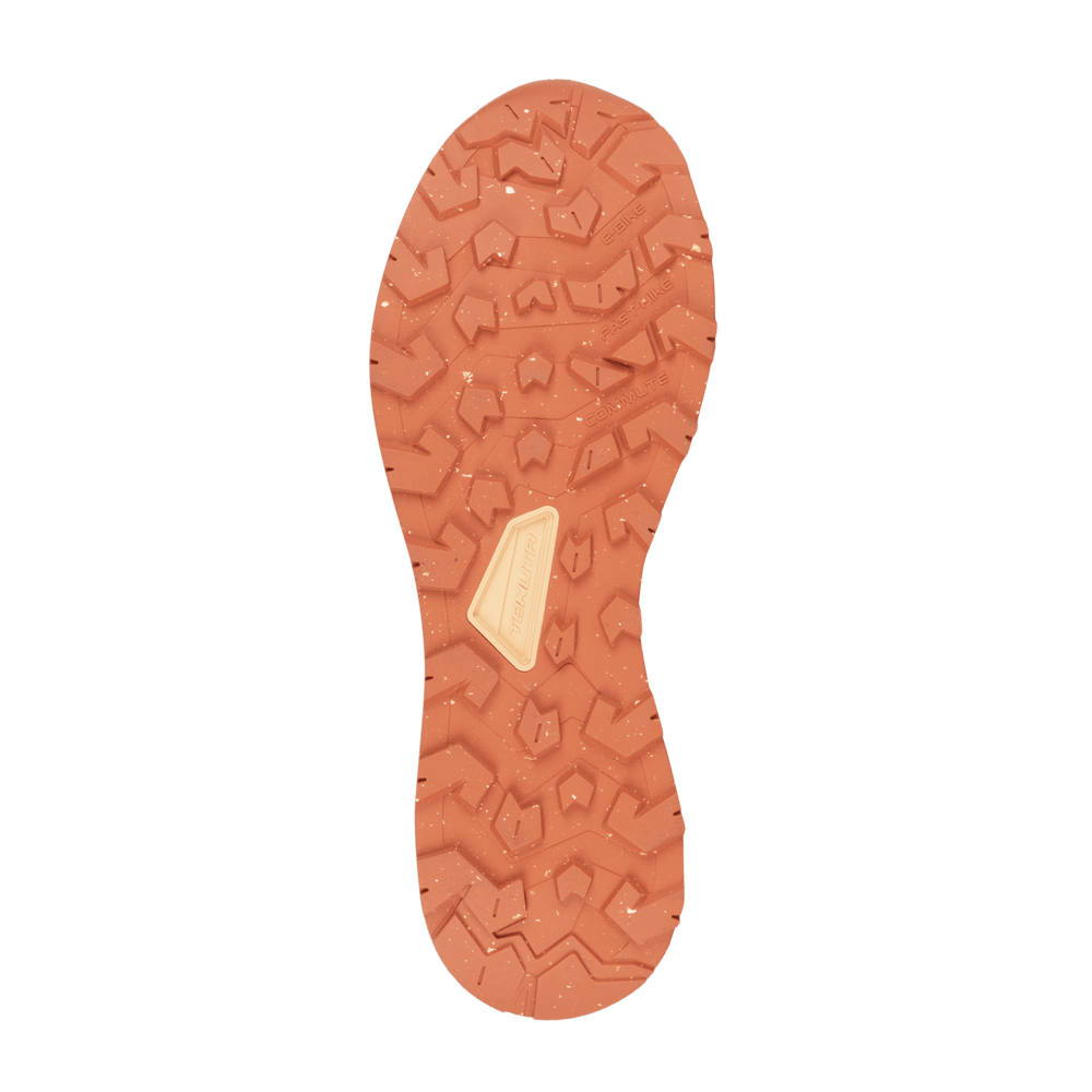 Modello versatile adatto a molteplici attività outdoor incluse escursioni leggere e veloci, utilizzo di e-bike ed avventure urbane. La tomaia è realizzata in materiali riciclati e senza luso di pellami di origine animale. I trattamenti di idrorepellenza sono liberi da PFAS così come la fodera impermeabile Gore-Tex realizzata in ePE. Le due densità della zeppa ed il battistrada sono co-stampati per ridurre lutilizzo di collanti. LEVA utilizzata è parzialmente bio-based. Il battistrada è in gomma parzialmente riciclata e a disegno asimmetrico in sincronia con il sistema AKU Elica Natural Stride System che favorisce lefficienza biodinamica. La parte interna dellavampiede ha una densità dei tappi maggiorata per favorire il grip sui pedali delle-bike.