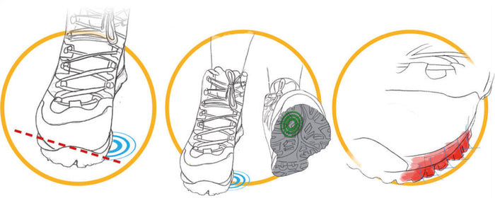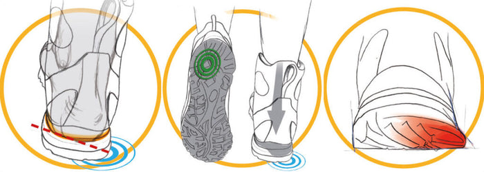 In fase di appoggio, il sottopiede di montaggio è inclinato verso l’esterno per assecondare l’appoggio del tallone. Nella zona esterna del tallone lo spessore ammortizzante è maggiore per assorbire l’impatto, mentre la zona anteriore interna della zeppa è composta da materiale ammortizzante per distribuire la forza di spinta. Il disegno asimmetrico del battistrada allineato con l’asse d’appoggio e il profilo sporgente aumentano la superficie di contatto.