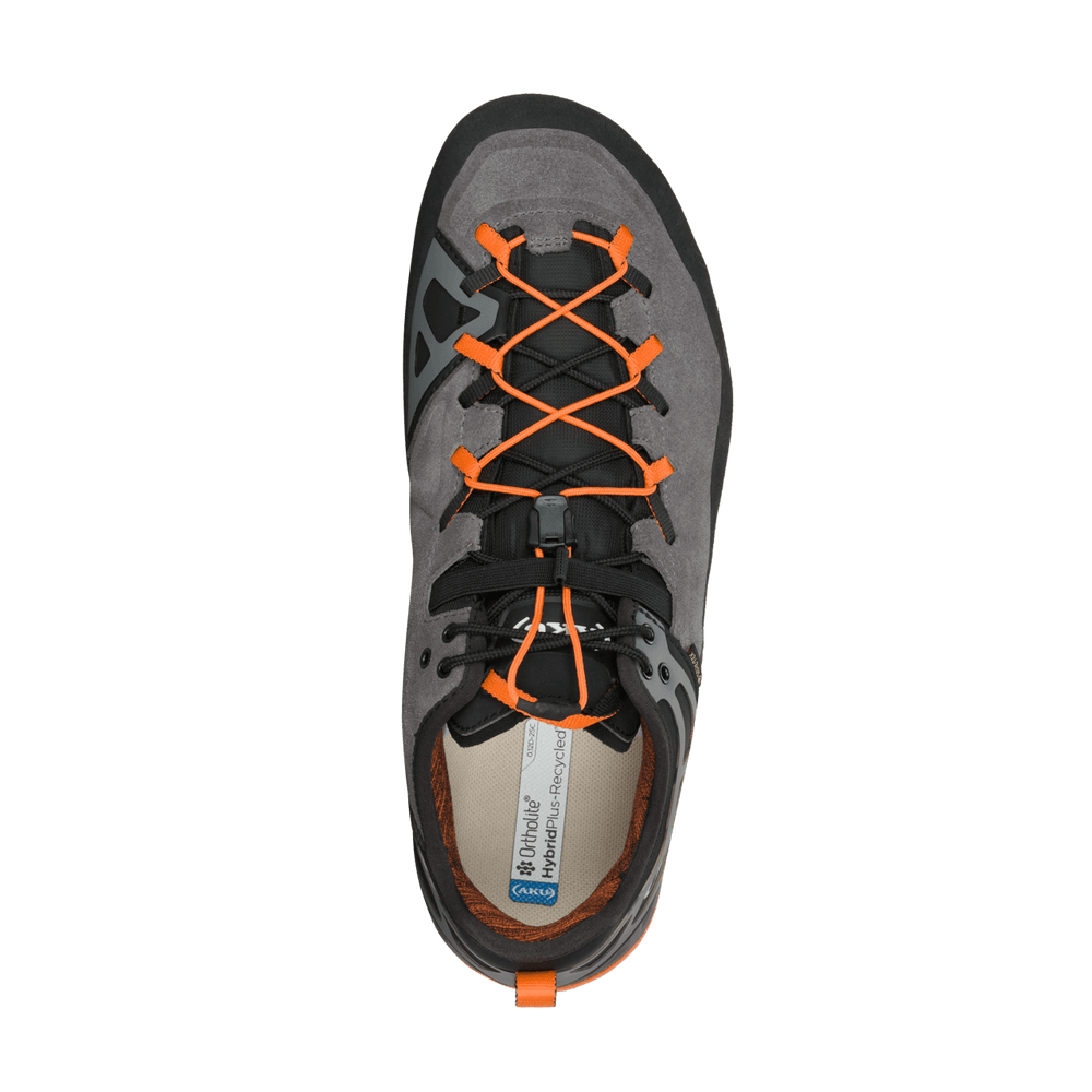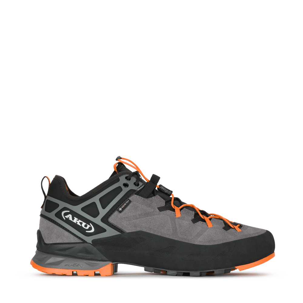 Calzatura da avvicinamento tecnico e climbing leggero, per vie ferrate ed escursioni su sentieri di montagna anche in presenza di pioggia. Evoluzione del modello Rock con miglioramenti tecnici di calzata. La tomaia in scamosciato, tessuto e microfibra resistente alle abrasioni è dotata di una protezione in gomma che avvolge e protegge la zeppa negli appoggi in arrampicata. Costruzione intersuola asimmetrica a doppia densità EVA e PU, adotta il sistema AKU Elica Natural Stride System per favorire lefficienza biodinamica. Personalizzazione della calzata con il sistema a doppia allacciatura Dual Fit System che permette di adeguare il comfort e la precisione della calzata durante le diverse fasi di utilizzo: un laccio tradizionale per massima comodità durante lavvicinamento ed un fast lacing per aumentare sensibilità e precisione in fase di arrampicata, anche sugli appoggi più piccoli. La suola Vibram Approcciosa con mescola Megagrip ad alte prestazioni fornisce il massimo grip con un design specifico per l'arrampicata.