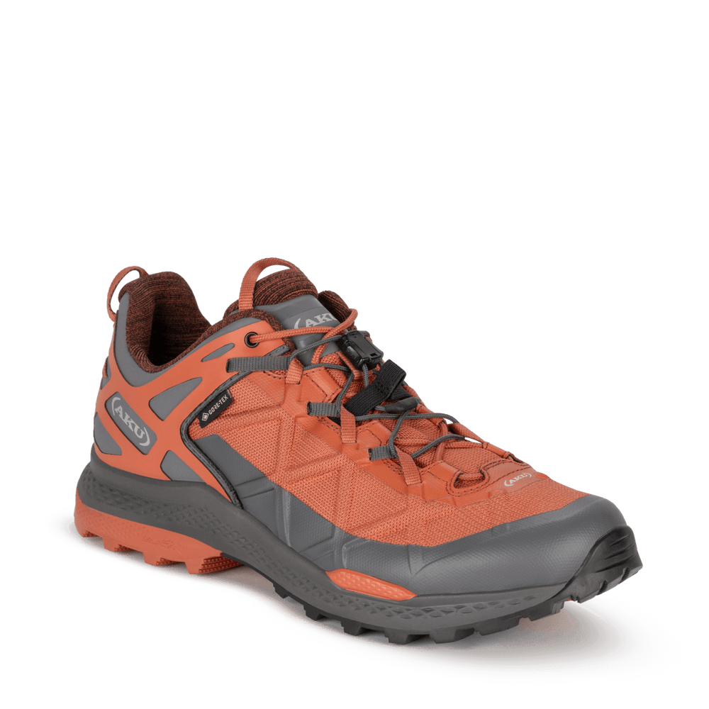 esclusiva AKU Dual Fit System (DFS), qui realizzata nella versione per lo speed hiking, consente di variare il grado di precisione della calzata agendo con semplicità sui due diversi sistemi di allacciatura. E' costruita con la tecnologia AKU Elica Natural Stride System per favorire lefficienza biodinamica.